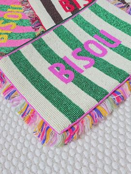 Mettez de la joie dans vos accessoires avec notre pochette perlée "BISOU". Entièrement brodée à la main avec une précision artisanale, elle affiche un message d'amour rouge sur un fond de rayures verticales blanc et bordeaux profond.