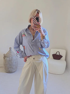 Donnez du peps à votre vestiaire avec cette chemise ample aux détails craquants. Ses broderies multi-couleurs (arc-en-ciel, cœur, lune, palmier) en font une pièce joyeuse et unique.