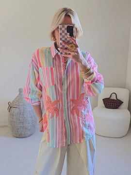 Laissez-vous transporter par l'esprit "Riviera" avec cette chemise ample aux couleurs acidulées. Ses rayures multicolores et ses impressionnants palmiers brodés en font la pièce maîtresse de votre garde-robe d'été.