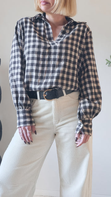Blouse avec manches amples à carreaux noirs et beige. Coupe loose. ( T.U du 36 au 40