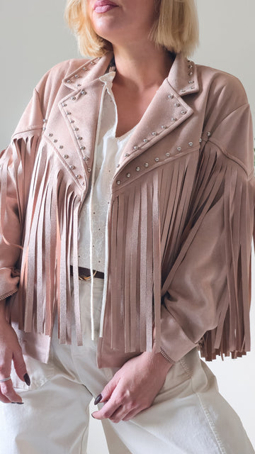 Veste NUDE ( beige rosé ) en suédine avec franges à l'avant et l'arrière + details clous argentés. ( T.U du 36 au 42 )