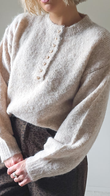 Pull intemporel avec boutons coeurs dorés. Coupe classique.